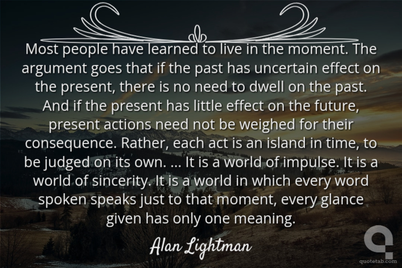 Most people have learned to live in the moment. The argument goes that if the past has uncertain effect on the present, there is no need to dwell on the past. And if the present has little effect on the future, present actions need not be weighed for their consequence. Rather, each act is an island in time, to be judged on its own. ... It is a world of impulse. It is a world of sincerity. It is a world in which every word spoken speaks just to that moment, every glance given has only one meaning.