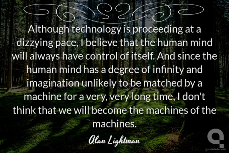 Although technology is proceeding at a dizzying pace, I believe that the human mind will always have control of itself. And since the human mind has a degree of infinity and imagination unlikely to be matched by a machine for a very, very long time, I don't think that we will become the machines of the machines.