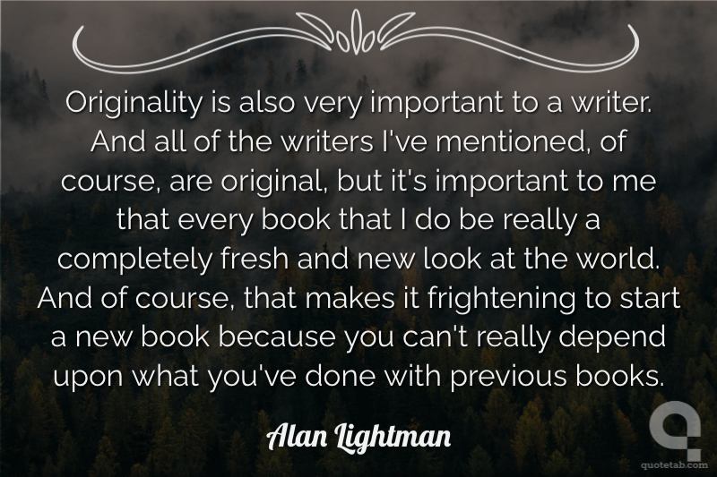 Originality is also very important to a writer. And all of the writers I've mentioned, of course, are original, but it's important to me that every book that I do be really a completely fresh and new look at the world. And of course, that makes it frightening to start a new book because you can't really depend upon what you've done with previous books.