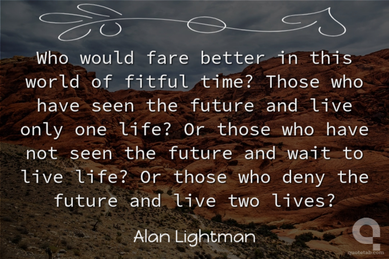 Who would fare better in this world of fitful time? Those who have seen the future and live only one life? Or those who have not seen the future and wait to live life? Or those who deny the future and live two lives?