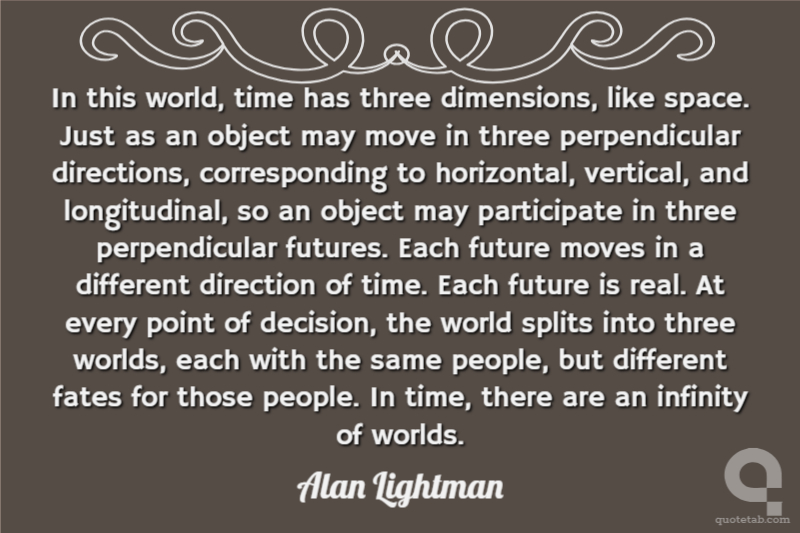 In this world, time has three dimensions, like space. Just as an object may move in three perpendicular directions, corresponding to horizontal, vertical, and longitudinal, so an object may participate in three perpendicular futures. Each future moves in a different direction of time. Each future is real. At every point of decision, the world splits into three worlds, each with the same people, but different fates for those people. In time, there are an infinity of worlds.