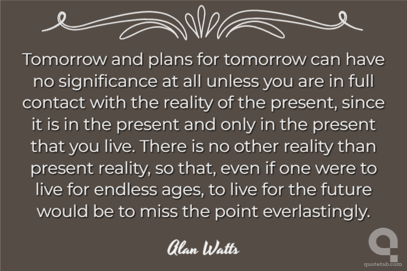 Tomorrow and plans for tomorrow can have no significance at all unless you are in full contact with the reality of the present, since it is in the present and only in the present that you live. There is no other reality than present reality, so that, even if one were to live for endless ages, to live for the future would be to miss the point everlastingly.