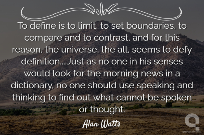 To define is to limit, to set boundaries, to compare and to contrast, and for this reason, the universe, the all, seems to defy definition....Just as no one in his senses would look for the morning news in a dictionary, no one should use speaking and thinking to find out what cannot be spoken or thought.