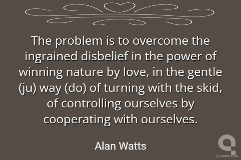 The problem is to overcome the ingrained disbelief in the power of winning nature by love, in the gentle (ju) way (do) of turning with the skid, of controlling ourselves by cooperating with ourselves.