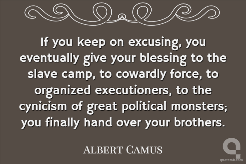 If you keep on excusing, you eventually give your blessing to the slave camp, to cowardly force, to organized executioners, to the cynicism of great political monsters; you finally hand over your brothers.
