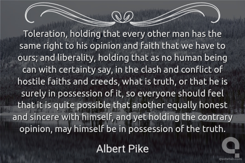 Toleration, holding that every other man has the same right to his opinion and faith that we have to ours; and liberality, holding that as no human being can with certainty say, in the clash and conflict of hostile faiths and creeds, what is truth, or that he is surely in possession of it, so everyone should feel that it is quite possible that another equally honest and sincere with himself, and yet holding the contrary opinion, may himself be in possession of the truth.