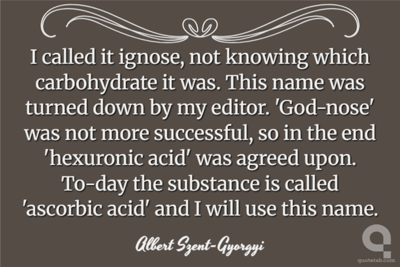 I called it ignose, not knowing which carbohydrate it was. This name was turned down by my editor. 'God-nose' was not more successful, so in the end 'hexuronic acid' was agreed upon. To-day the substance is called 'ascorbic acid' and I will use this name.