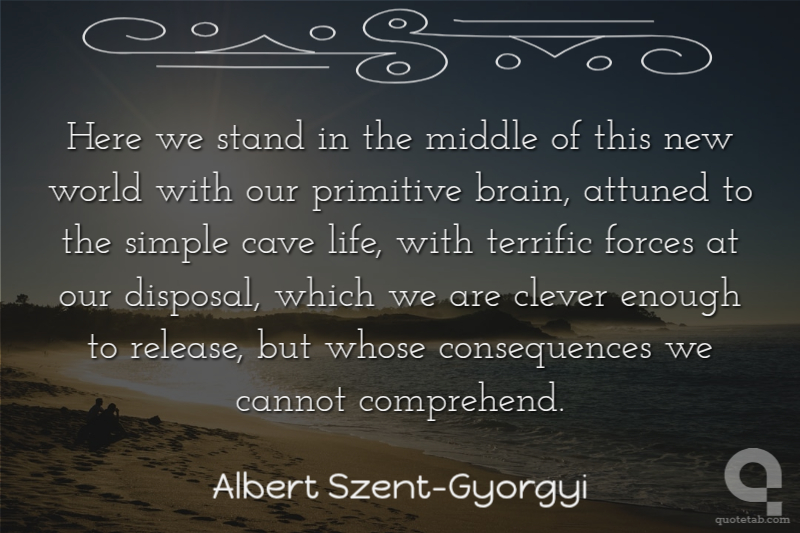 Here we stand in the middle of this new world with our primitive brain, attuned to the simple cave life, with terrific forces at our disposal, which we are clever enough to release, but whose consequences we cannot comprehend.