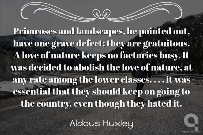Primroses and landscapes, he pointed out, have one grave defect: they are gratuitous. A love of nature keeps no factories busy. It was decided to abolish the love of nature, at any rate among the lower classes. . . . it was essential that they should keep on going to the country, even though they hated it.