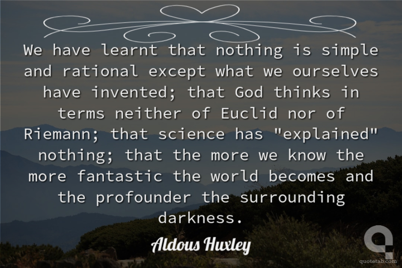 We have learnt that nothing is simple and rational except what we ourselves have invented; that God thinks in terms neither of Euclid nor of Riemann; that science has "explained" nothing; that the more we know the more fantastic the world becomes and the profounder the surrounding darkness.