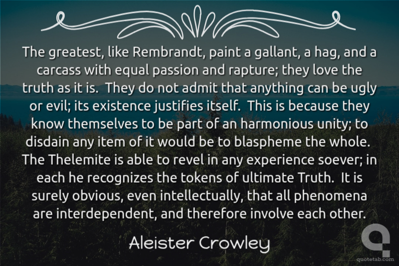 The greatest, like Rembrandt, paint a gallant, a hag, and a carcass with equal passion and rapture; they love the truth as it is. They do not admit that anything can be ugly or evil; its existence justifies itself. This is because they know themselves to be part of an harmonious unity; to disdain any item of it would be to blaspheme the whole. The Thelemite is able to revel in any experience soever; in each he recognizes the tokens of ultimate Truth. It is surely obvious, even intellectually, that all phenomena are interdependent, and therefore involve each other.