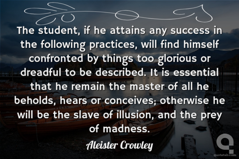 The student, if he attains any success in the following practices, will find himself confronted by things too glorious or dreadful to be described. It is essential that he remain the master of all he beholds, hears or conceives; otherwise he will be the slave of illusion, and the prey of madness.