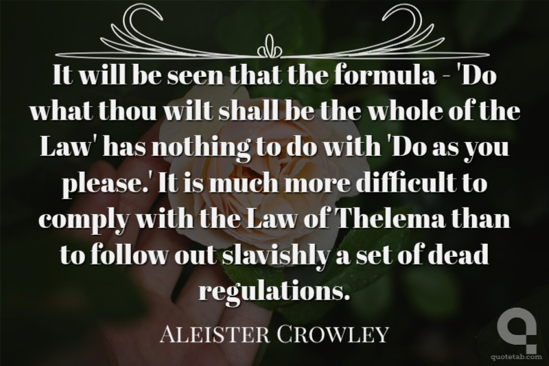 It will be seen that the formula - 'Do what thou wilt shall be the whole of the Law' has nothing to do with 'Do as you please.' It is much more difficult to comply with the Law of Thelema than to follow out slavishly a set of dead regulations.