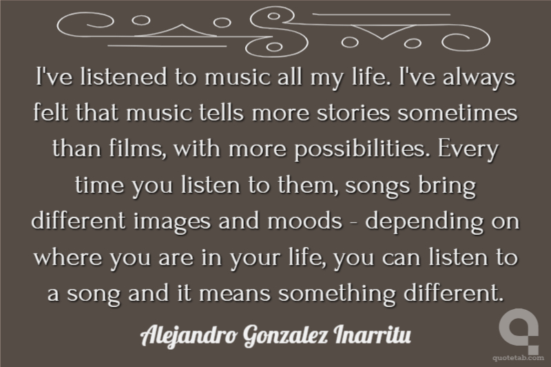 I've listened to music all my life. I've always felt that music tells more stories sometimes than films, with more possibilities. Every time you listen to them, songs bring different images and moods - depending on where you are in your life, you can listen to a song and it means something different.