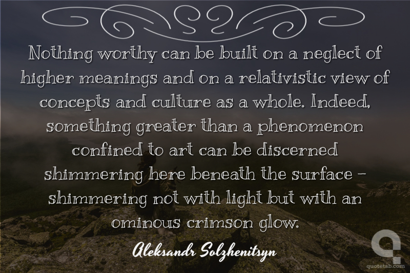 Nothing worthy can be built on a neglect of higher meanings and on a relativistic view of concepts and culture as a whole. Indeed, something greater than a phenomenon confined to art can be discerned shimmering here beneath the surface - shimmering not with light but with an ominous crimson glow.
