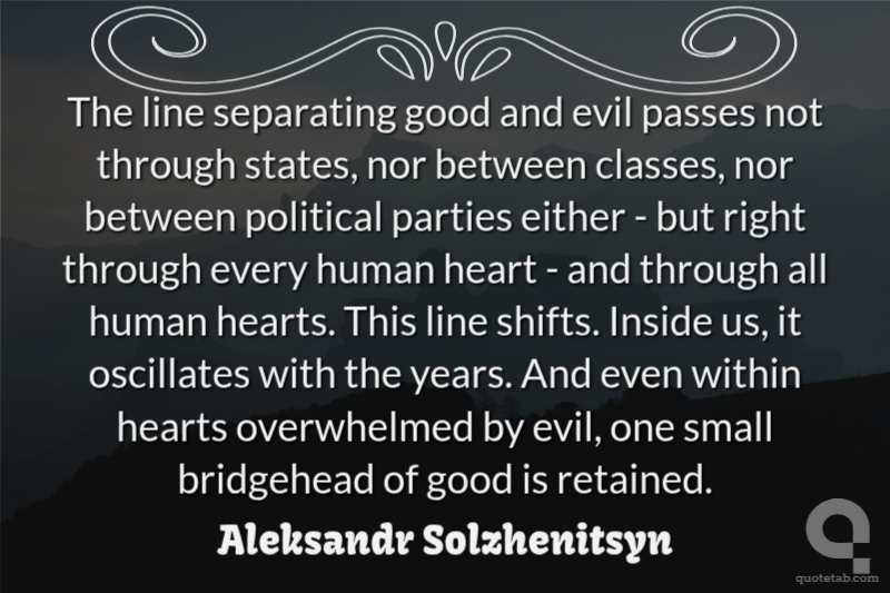 The line separating good and evil passes not through states, nor between classes, nor between political parties either - but right through every human heart - and through all human hearts. This line shifts. Inside us, it oscillates with the years. And even within hearts overwhelmed by evil, one small bridgehead of good is retained.