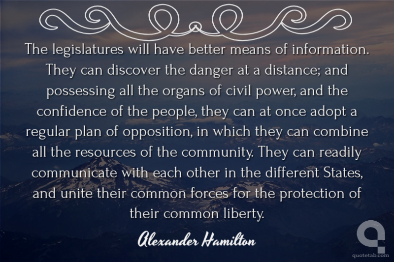 The legislatures will have better means of information. They can discover the danger at a distance; and possessing all the organs of civil power, and the confidence of the people, they can at once adopt a regular plan of opposition, in which they can combine all the resources of the community. They can readily communicate with each other in the different States, and unite their common forces for the protection of their common liberty.