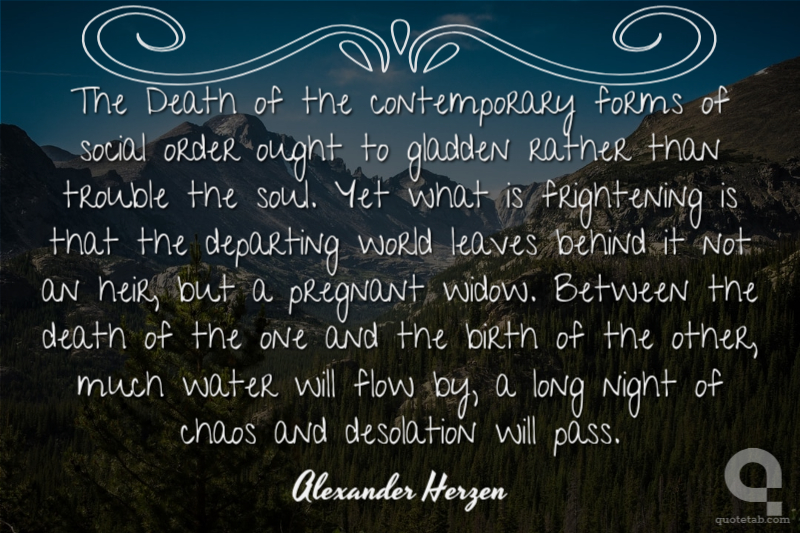 The Death of the contemporary forms of social order ought to gladden rather than trouble the soul. Yet what is frightening is that the departing world leaves behind it not an heir, but a pregnant widow. Between the death of the one and the birth of the other, much water will flow by, a long night of chaos and desolation will pass.