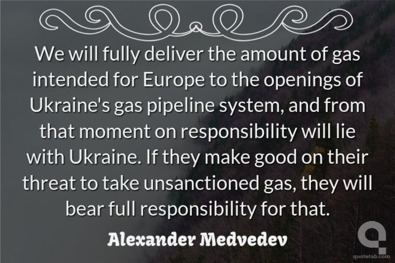 We will fully deliver the amount of gas intended for Europe to the openings of Ukraine's gas pipeline system, and from that moment on responsibility will lie with Ukraine. If they make good on their threat to take unsanctioned gas, they will bear full responsibility for that.