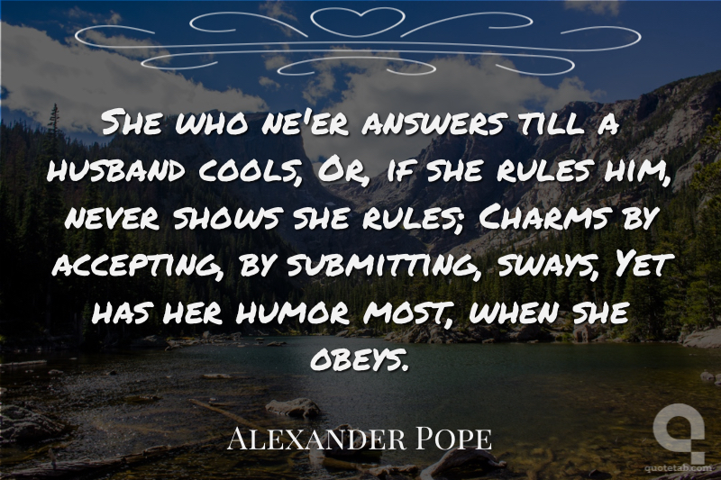 She who ne'er answers till a husband cools, Or, if she rules him, never shows she rules; Charms by accepting, by submitting, sways, Yet has her humor most, when she obeys.