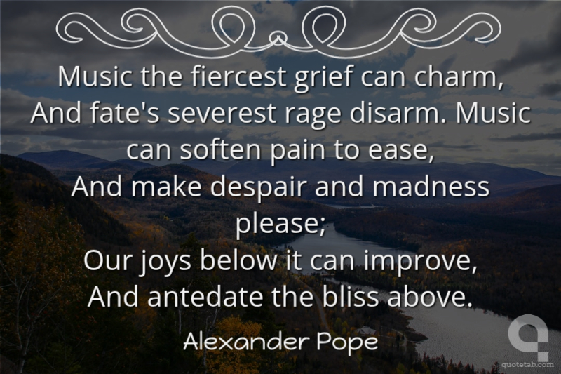 Music the fiercest grief can charm, And fate's severest rage disarm. Music can soften pain to ease, And make despair and madness please; Our joys below it can improve, And antedate the bliss above.