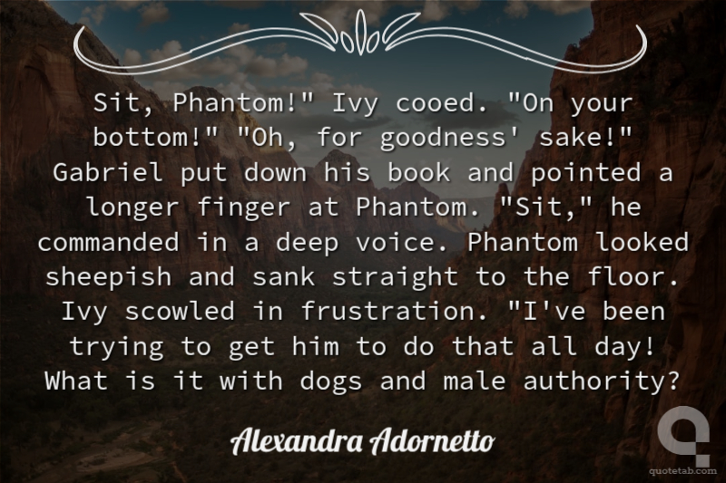 Sit, Phantom!" Ivy cooed. "On your bottom!" "Oh, for goodness' sake!" Gabriel put down his book and pointed a longer finger at Phantom. "Sit," he commanded in a deep voice. Phantom looked sheepish and sank straight to the floor. Ivy scowled in frustration. "I've been trying to get him to do that all day! What is it with dogs and male authority?