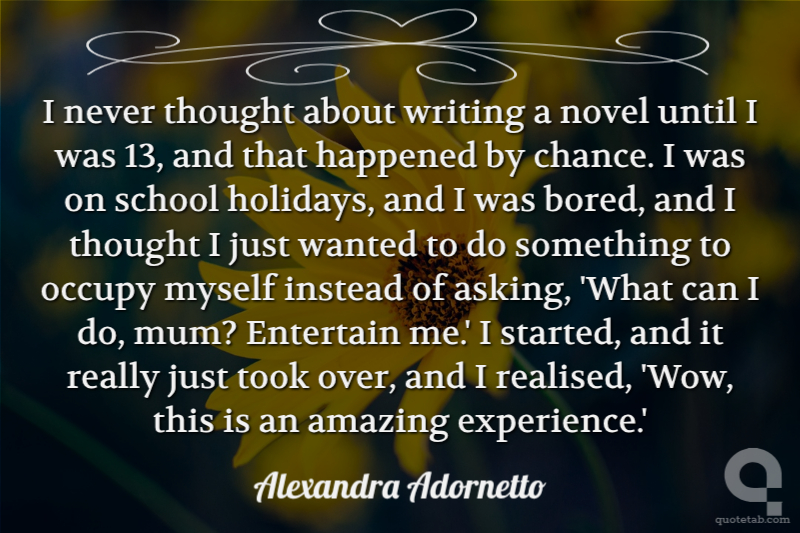 I never thought about writing a novel until I was 13, and that happened by chance. I was on school holidays, and I was bored, and I thought I just wanted to do something to occupy myself instead of asking, 'What can I do, mum? Entertain me.' I started, and it really just took over, and I realised, 'Wow, this is an amazing experience.'