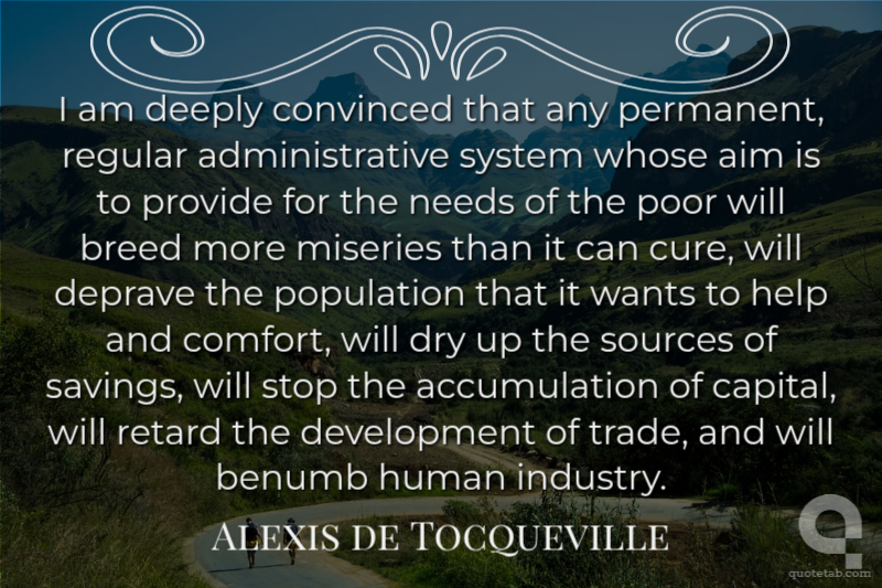I am deeply convinced that any permanent, regular administrative system whose aim is to provide for the needs of the poor will breed more miseries than it can cure, will deprave the population that it wants to help and comfort, will dry up the sources of savings, will stop the accumulation of capital, will retard the development of trade, and will benumb human industry.