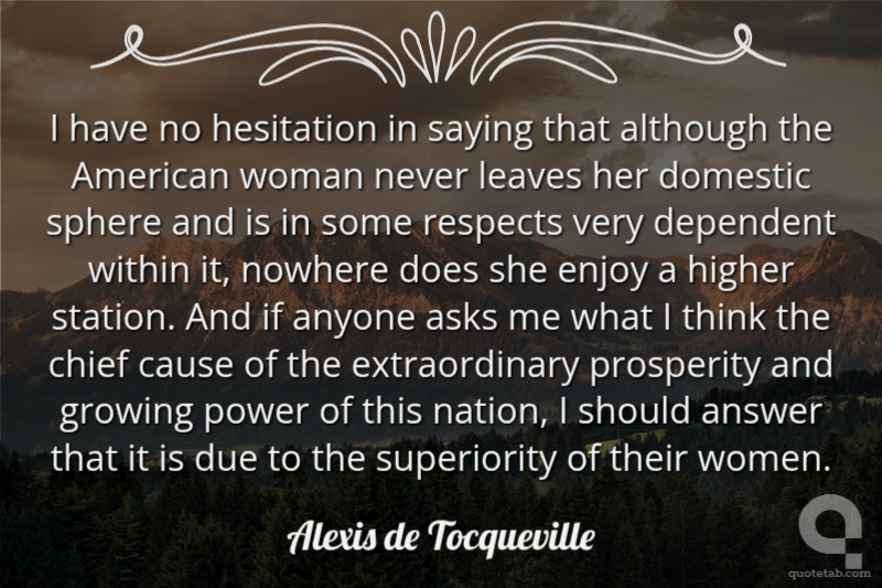 I have no hesitation in saying that although the American woman never leaves her domestic sphere and is in some respects very dependent within it, nowhere does she enjoy a higher station. And if anyone asks me what I think the chief cause of the extraordinary prosperity and growing power of this nation, I should answer that it is due to the superiority of their women.