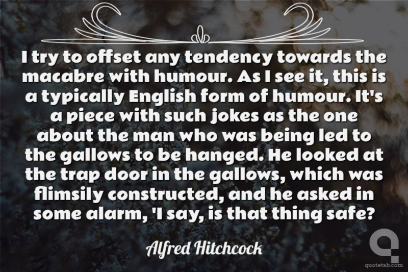 I try to offset any tendency towards the macabre with humour. As I see it, this is a typically English form of humour. It's a piece with such jokes as the one about the man who was being led to the gallows to be hanged. He looked at the trap door in the gallows, which was flimsily constructed, and he asked in some alarm, 'I say, is that thing safe?