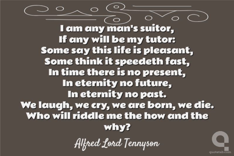 I am any man's suitor, If any will be my tutor: Some say this life is pleasant, Some think it speedeth fast, In time there is no present, In eternity no future, In eternity no past. We laugh, we cry, we are born, we die. Who will riddle me the how and the why?