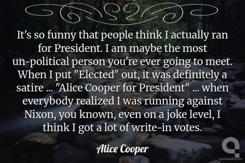 It's so funny that people think I actually ran for President. I am maybe the most un-political person you're ever going to meet. When I put "Elected" out, it was definitely a satire ... "Alice Cooper for President" ... when everybody realized I was running against Nixon, you known, even on a joke level, I think I got a lot of write-in votes.