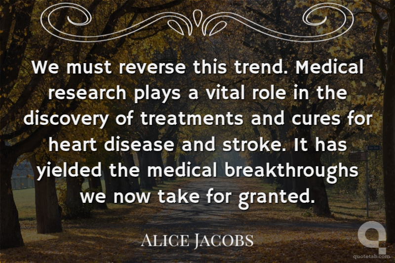 We must reverse this trend. Medical research plays a vital role in the discovery of treatments and cures for heart disease and stroke. It has yielded the medical breakthroughs we now take for granted.