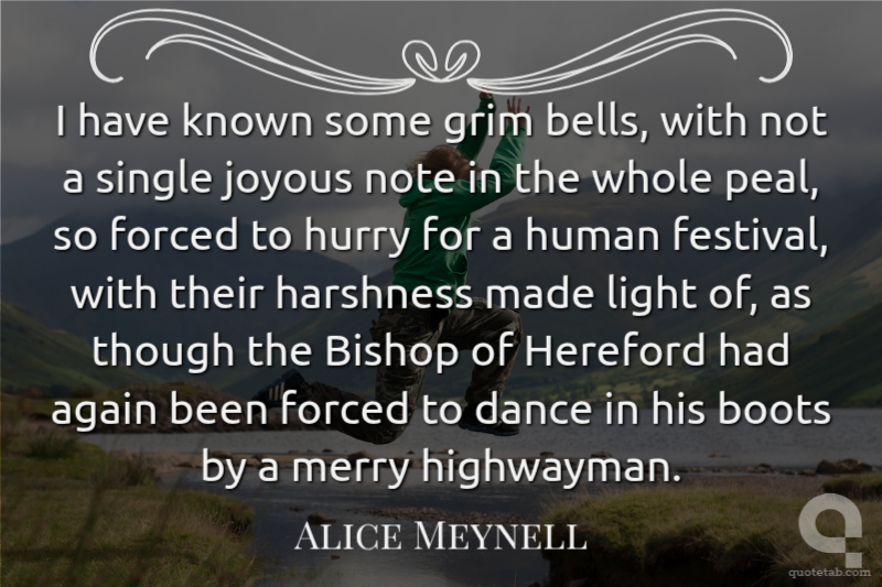 I have known some grim bells, with not a single joyous note in the whole peal, so forced to hurry for a human festival, with their harshness made light of, as though the Bishop of Hereford had again been forced to dance in his boots by a merry highwayman.