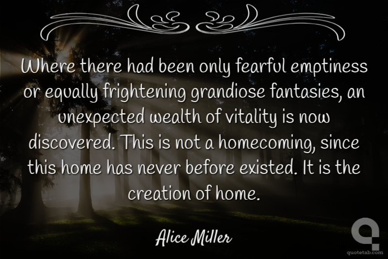 Where there had been only fearful emptiness or equally frightening grandiose fantasies, an unexpected wealth of vitality is now discovered. This is not a homecoming, since this home has never before existed. It is the creation of home.
