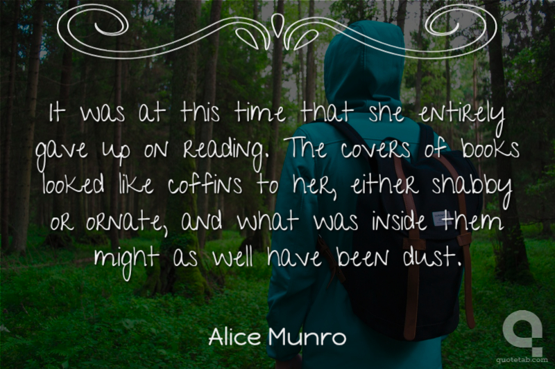 It was at this time that she entirely gave up on reading. The covers of books looked like coffins to her, either shabby or ornate, and what was inside them might as well have been dust.