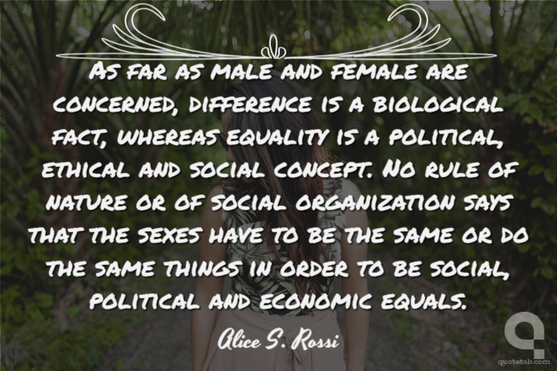 As far as male and female are concerned, difference is a biological fact, whereas equality is a political, ethical and social concept. No rule of nature or of social organization says that the sexes have to be the same or do the same things in order to be social, political and economic equals.