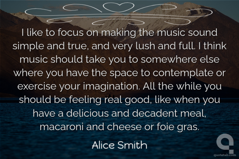 I like to focus on making the music sound simple and true, and very lush and full. I think music should take you to somewhere else where you have the space to contemplate or exercise your imagination. All the while you should be feeling real good, like when you have a delicious and decadent meal, macaroni and cheese or foie gras.