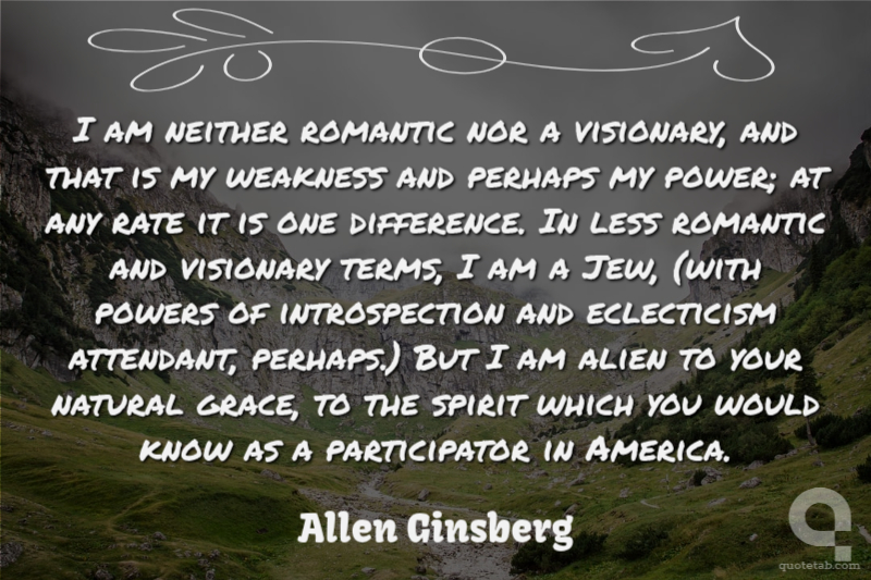 I am neither romantic nor a visionary, and that is my weakness and perhaps my power; at any rate it is one difference. In less romantic and visionary terms, I am a Jew, (with powers of introspection and eclecticism attendant, perhaps.) But I am alien to your natural grace, to the spirit which you would know as a participator in America.