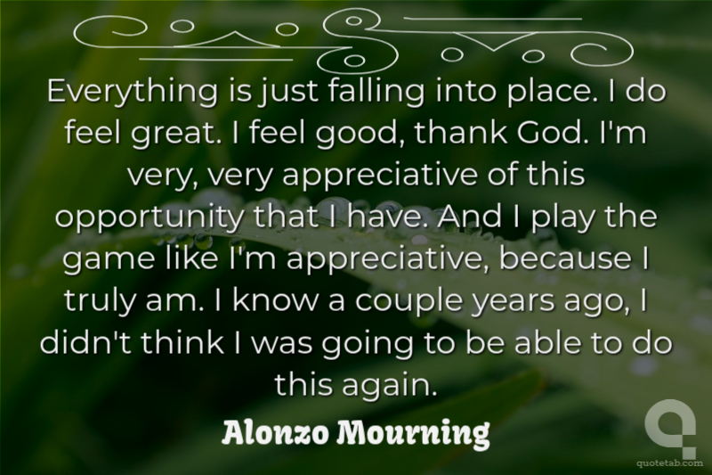 Everything is just falling into place. I do feel great. I feel good, thank God. I'm very, very appreciative of this opportunity that I have. And I play the game like I'm appreciative, because I truly am. I know a couple years ago, I didn't think I was going to be able to do this again.