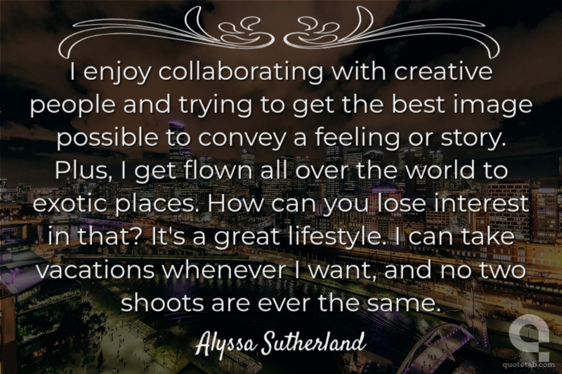 I enjoy collaborating with creative people and trying to get the best image possible to convey a feeling or story. Plus, I get flown all over the world to exotic places. How can you lose interest in that? It's a great lifestyle. I can take vacations whenever I want, and no two shoots are ever the same.