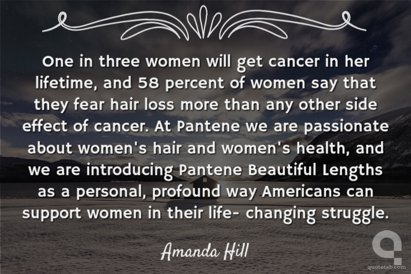 One in three women will get cancer in her lifetime, and 58 percent of women say that they fear hair loss more than any other side effect of cancer. At Pantene we are passionate about women's hair and women's health, and we are introducing Pantene Beautiful Lengths as a personal, profound way Americans can support women in their life- changing struggle.