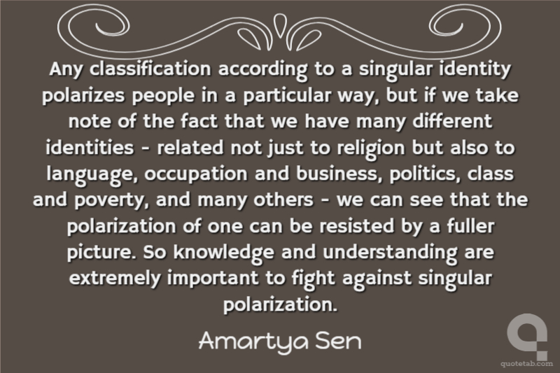 Any classification according to a singular identity polarizes people in a particular way, but if we take note of the fact that we have many different identities - related not just to religion but also to language, occupation and business, politics, class and poverty, and many others - we can see that the polarization of one can be resisted by a fuller picture. So knowledge and understanding are extremely important to fight against singular polarization.