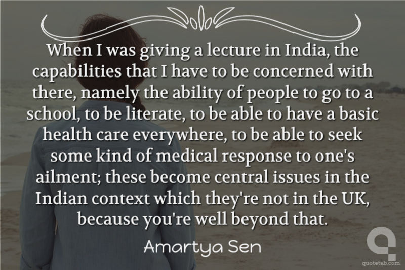When I was giving a lecture in India, the capabilities that I have to be concerned with there, namely the ability of people to go to a school, to be literate, to be able to have a basic health care everywhere, to be able to seek some kind of medical response to one's ailment; these become central issues in the Indian context which they're not in the UK, because you're well beyond that.