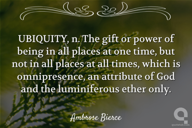 UBIQUITY, n. The gift or power of being in all places at one time, but not in all places at all times, which is omnipresence, an attribute of God and the luminiferous ether only.