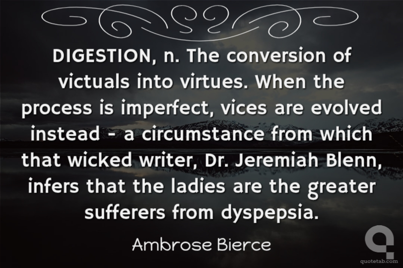 DIGESTION, n. The conversion of victuals into virtues. When the process is imperfect, vices are evolved instead - a circumstance from which that wicked writer, Dr. Jeremiah Blenn, infers that the ladies are the greater sufferers from dyspepsia.