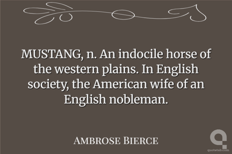 MUSTANG, n. An indocile horse of the western plains. In English society, the American wife of an English nobleman.