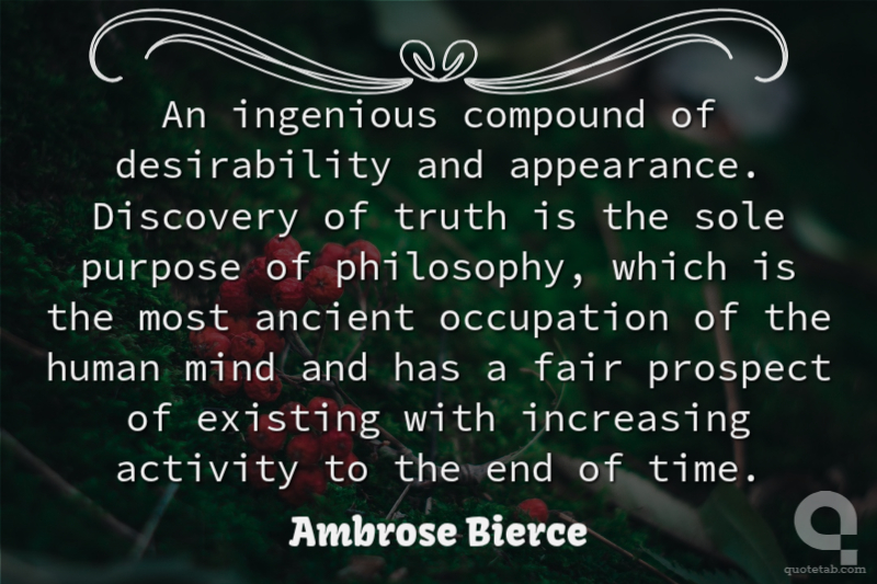 An ingenious compound of desirability and appearance. Discovery of truth is the sole purpose of philosophy, which is the most ancient occupation of the human mind and has a fair prospect of existing with increasing activity to the end of time.