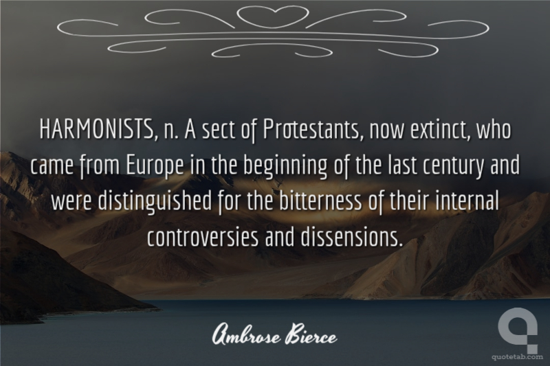 HARMONISTS, n. A sect of Protestants, now extinct, who came from Europe in the beginning of the last century and were distinguished for the bitterness of their internal controversies and dissensions.