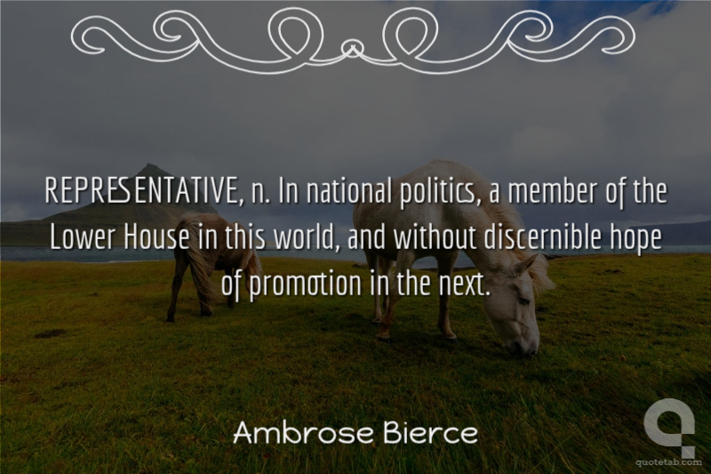 REPRESENTATIVE, n. In national politics, a member of the Lower House in this world, and without discernible hope of promotion in the next.